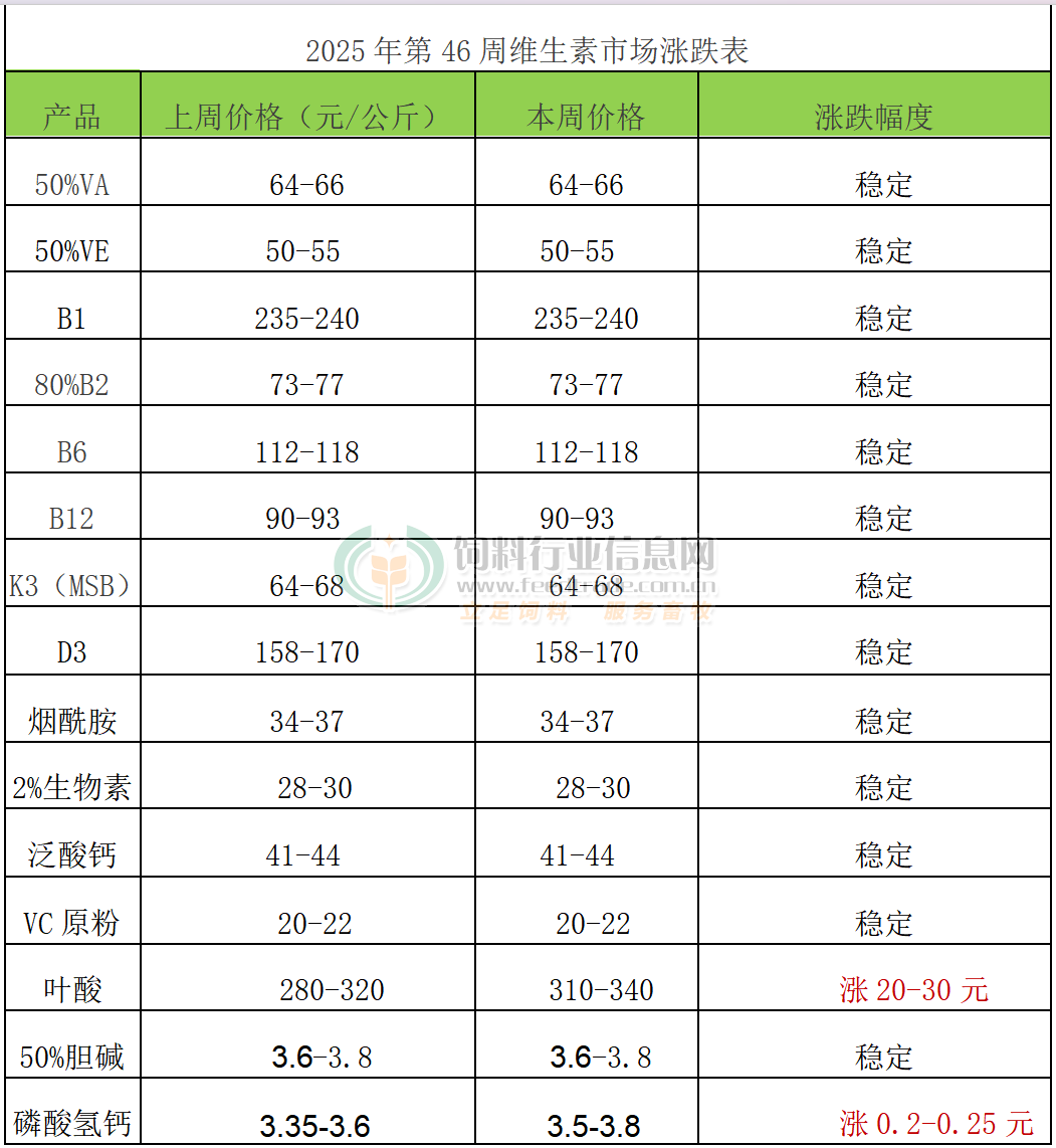 叶酸:本周市场报310-340元/公斤左右。近日原料上涨,11月10日市场称天新药业叶酸提价至362元/公斤,部分厂家停报,市场偏强运行。