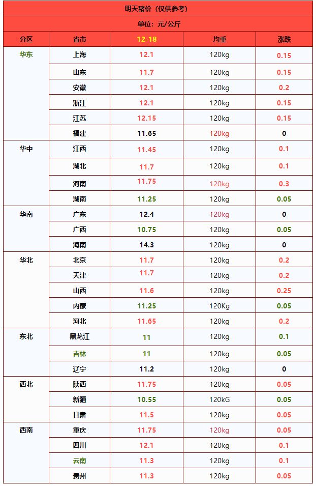 | 安徽省 | 12.02 | 11.96 | 0.50% | 元/KG | |