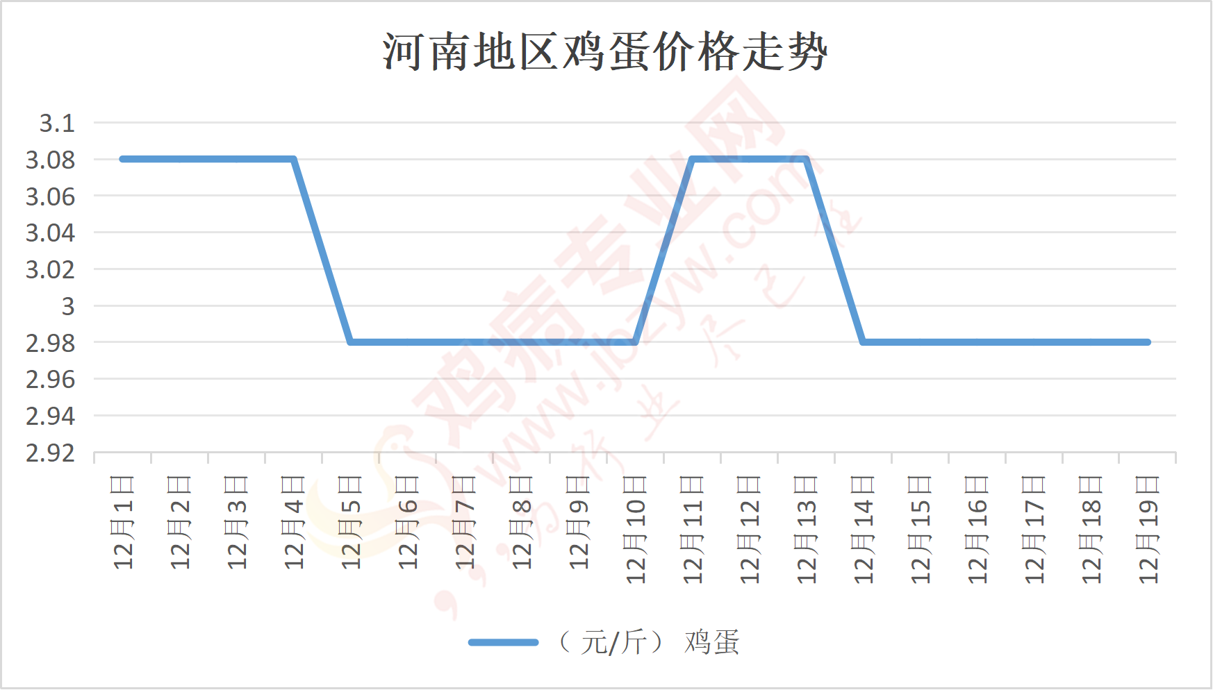 鸡病专业网消息:12月19日,河南郑州鸡蛋3元/斤,稳;新密鸡蛋3元/斤,稳;荥阳鸡蛋3元/斤,稳;中牟鸡蛋3元/斤,稳;周口鸡蛋2.95元/斤,稳;商丘鸡蛋90元/30斤,稳;鹤壁鸡蛋2.95元/斤,稳;汝州鸡蛋2.95元/斤,稳;开封鸡蛋90元/30斤,稳;漯河鸡蛋2.95元/斤,稳;漯河临颍鸡蛋2.95元/斤,稳;许昌鸡蛋3元/斤,稳;南阳鸡蛋2.95元/斤,稳;南阳邓州鸡蛋2.95元/斤,稳;新乡鸡蛋2.95元/斤,稳;安阳鸡蛋2.95元/斤,稳;新郑鸡蛋3元/斤,稳;登封鸡蛋3元/斤,稳;平顶山鸡蛋3元/斤,稳;驻马店鸡蛋3元/斤,稳;三门峡鸡蛋3元/斤,稳;焦作鸡蛋2.95元/斤,稳;信阳鸡蛋2.95元/斤,稳;濮阳鸡蛋2.95元/斤,稳。