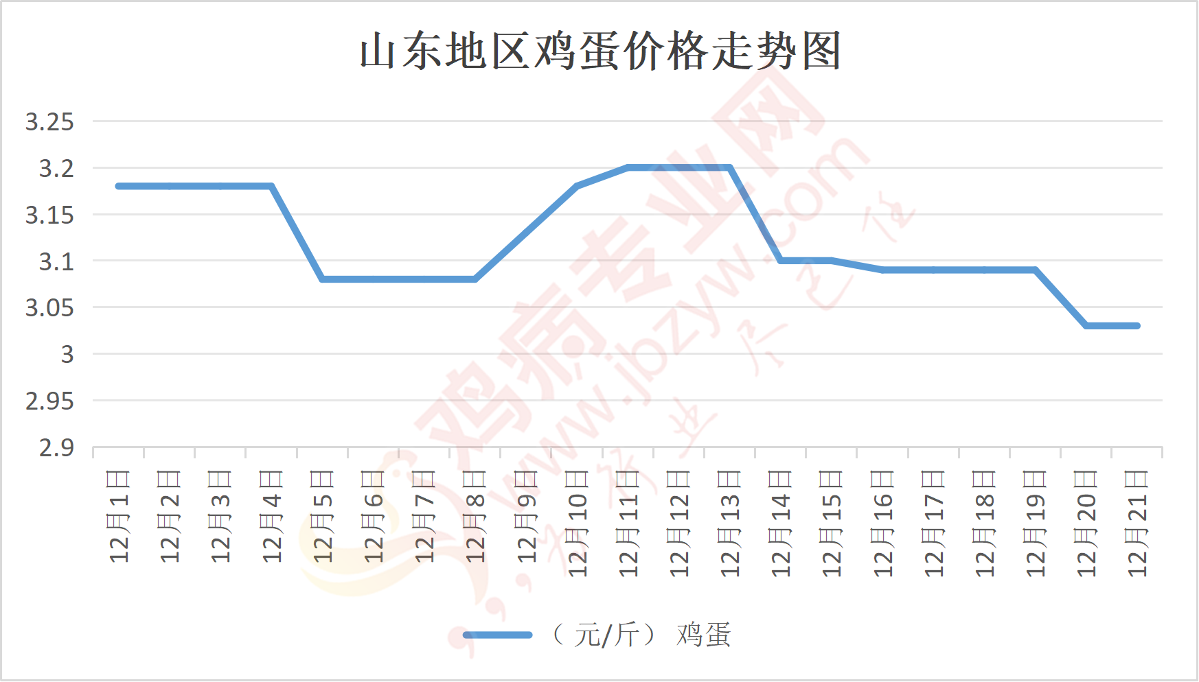 鸡病专业网消息:12月21日,山东地区莱阳鸡蛋3.1元/斤,稳;青岛鸡蛋3.1元/斤,稳;诸城鸡蛋3.1元/斤,稳;安丘鸡蛋2.95元/斤,稳;昌乐鸡蛋2.95元/斤,稳;寿光鸡蛋2.95元/斤,稳;昌邑鸡蛋2.95元/斤,稳;高密鸡蛋3.1元/斤,稳;青州鸡蛋2.95元/斤,稳;临朐鸡蛋2.95元/斤,稳;莱州鸡蛋3.1元/斤,稳;威海鸡蛋3.1元/斤,稳;临沭鸡蛋3元/斤,稳;沂水鸡蛋3元/斤,稳;沂南鸡蛋3元/斤,稳;莒南鸡蛋3元/斤,稳;兰陵县鸡蛋3元/斤,稳;日照鸡蛋3元/斤,稳;莒县鸡蛋3元/斤,稳;日照辛萁商贸鸡蛋3元/斤,稳;泗水鸡蛋价格87元/斤,稳;济宁、汶上鸡蛋价格87元/斤,稳;梁山、东平红蛋价格87元/斤,稳;枣庄滕州地区鸡蛋混码主流到户87元/30斤,稳;泰安地区新泰鸡蛋价格87元/斤,稳;菏泽地区曹县主流到户87元/斤,稳;成武鸡蛋价格87元/斤,稳;单县到户87元/斤,稳;聊城莘县87元/斤,稳。