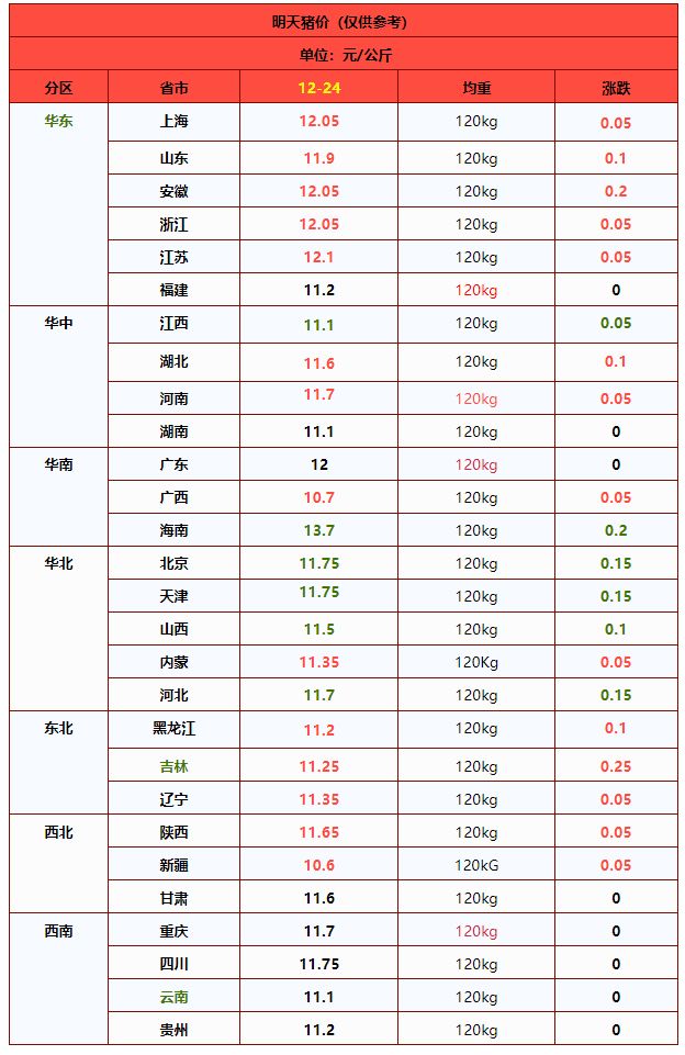 | 华南 | 广东省 | 12.04 | 12.02 | 0.17% | 元/KG |