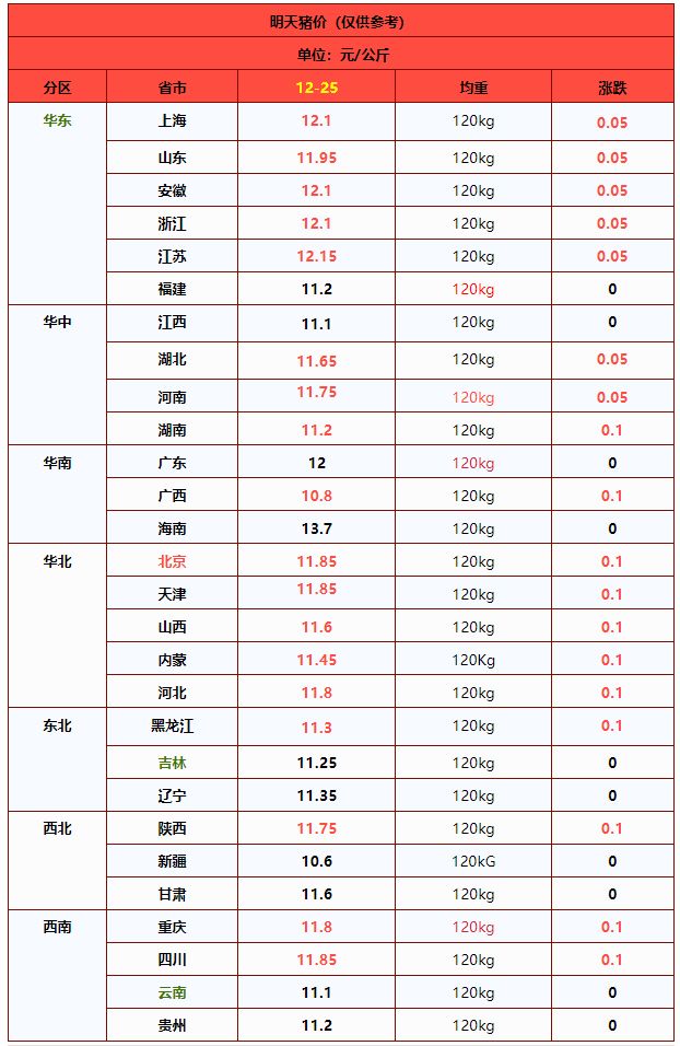 | 浙江省 | 12.12 | 12.09 | 0.25% | 元/KG | |