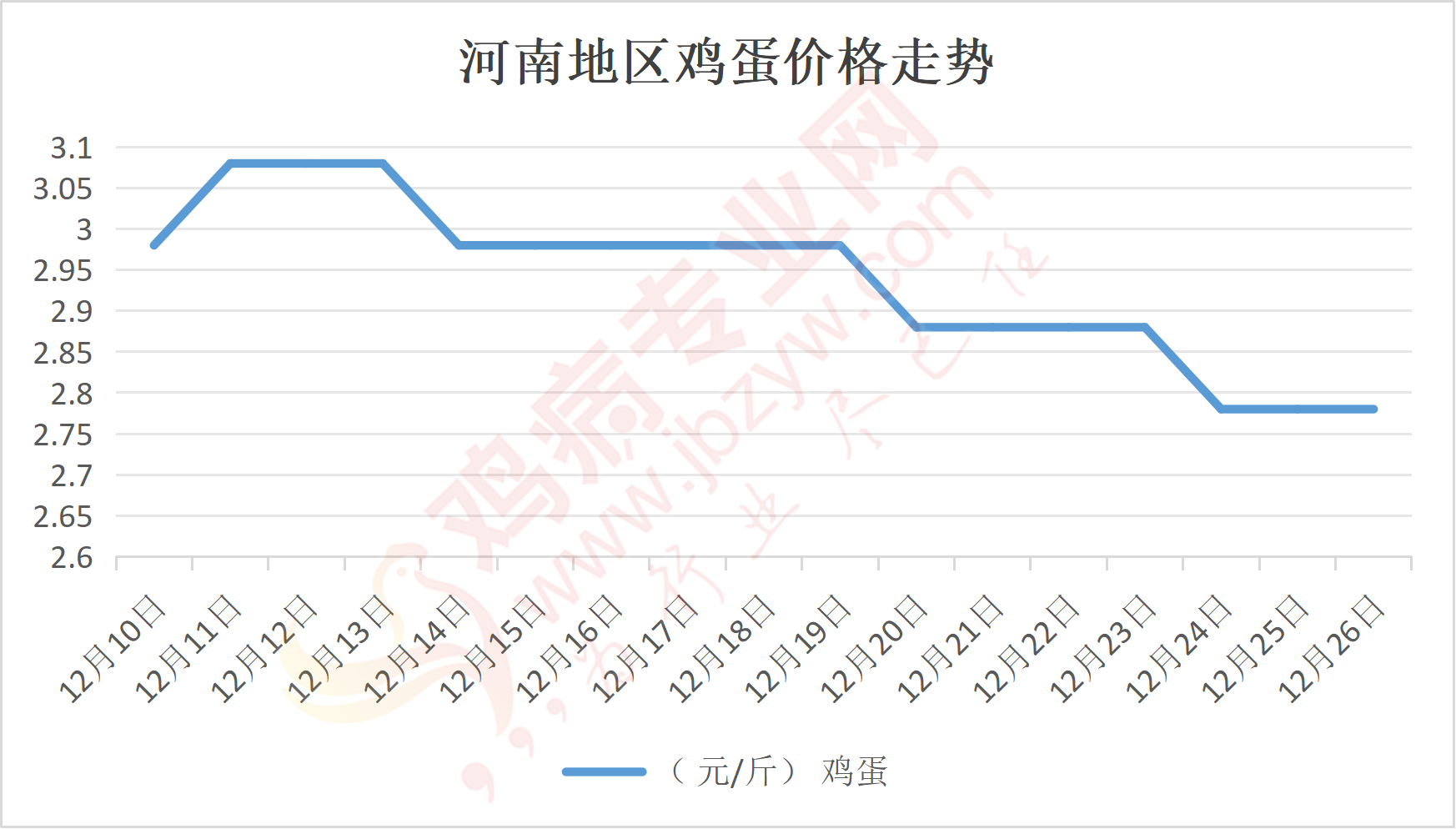 鸡病专业网消息:12月26日,河南郑州鸡蛋2.8元/斤,稳;新密鸡蛋2.8元/斤,稳;荥阳鸡蛋2.8元/斤,稳;中牟鸡蛋2.8元/斤,稳;周口鸡蛋2.75元/斤,稳;商丘鸡蛋84元/30斤,稳;鹤壁鸡蛋2.75元/斤,稳;汝州鸡蛋2.75元/斤,稳;开封鸡蛋84元/30斤,稳;漯河鸡蛋2.75元/斤,稳;漯河临颍鸡蛋2.75元/斤,稳;许昌鸡蛋2.8元/斤,稳;南阳鸡蛋2.75元/斤,稳;南阳邓州鸡蛋2.75元/斤,稳;新乡鸡蛋2.75元/斤,稳;安阳鸡蛋2.75元/斤,稳;新郑鸡蛋2.8元/斤,稳;登封鸡蛋2.8元/斤,稳;平顶山鸡蛋2.8元/斤,稳;驻马店鸡蛋2.8元/斤,稳;三门峡鸡蛋2.8元/斤,稳;焦作鸡蛋2.75元/斤,稳;信阳鸡蛋2.75元/斤,稳;濮阳鸡蛋2.75元/斤,稳。