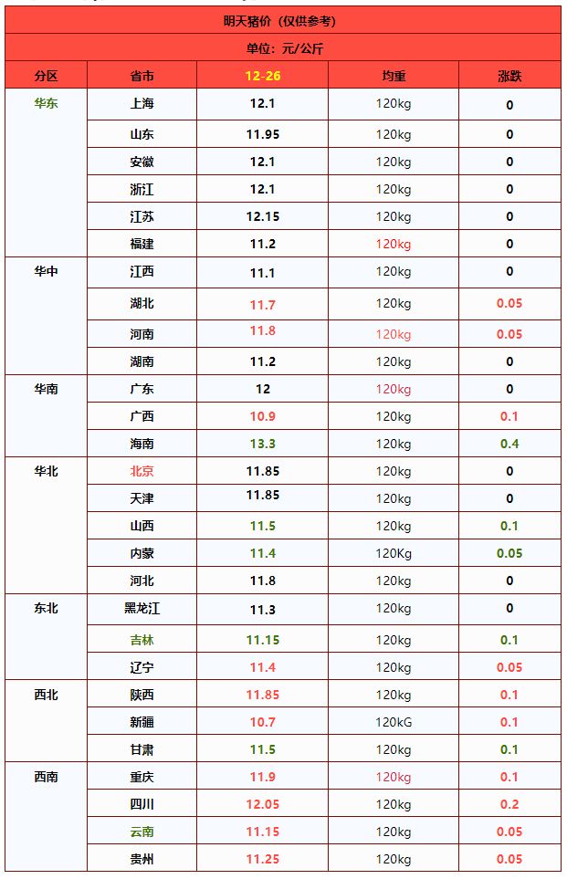 | 安徽省 | 12.04 | 12.05 | -0.08% | 元/KG | |