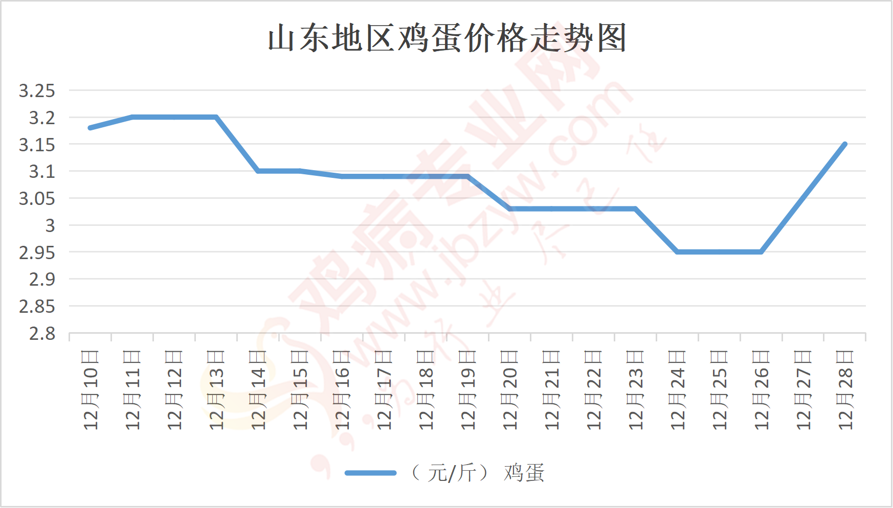 鸡病专业网消息:12月28日,山东地区莱阳鸡蛋3.2元/斤,涨;青岛鸡蛋3.2元/斤,涨;诸城鸡蛋3.2元/斤,涨;安丘鸡蛋3.1元/斤,涨;昌乐鸡蛋3.1元/斤,涨;寿光鸡蛋3.1元/斤,涨;昌邑鸡蛋3.1元/斤,涨;高密鸡蛋3.2元/斤,涨;青州鸡蛋3.1元/斤,涨;临朐鸡蛋3.1元/斤,涨;莱州鸡蛋3.2元/斤,涨;威海鸡蛋3.2元/斤,涨;临沭鸡蛋3.1元/斤,涨;沂水鸡蛋3.1元/斤,涨;沂南鸡蛋3.1元/斤,涨;莒南鸡蛋3.1元/斤,涨;兰陵县鸡蛋3.1元/斤,涨;日照鸡蛋3.1元/斤,涨;莒县鸡蛋3.1元/斤,涨;日照辛萁商贸鸡蛋3.1元/斤,涨;泗水鸡蛋价格90元/斤,涨;济宁、汶上鸡蛋价格90元/斤,涨;梁山、东平红蛋价格90元/斤,涨;枣庄滕州地区鸡蛋混码主流到户90元/30斤,涨;泰安地区新泰鸡蛋价格90元/斤,涨;菏泽地区曹县主流到户90元/斤,涨;成武鸡蛋价格90元/斤,涨;单县到户90元/斤,涨;聊城莘县90元/斤,涨。