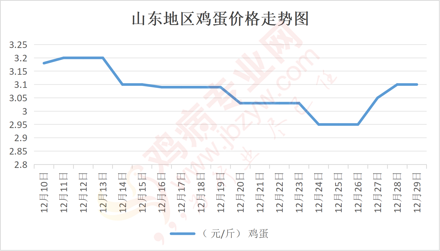 鸡病专业网消息:12月29日,山东地区莱阳鸡蛋3.15元/斤,稳;青岛鸡蛋3.15元/斤,稳;诸城鸡蛋3.15元/斤,稳;安丘鸡蛋3.05元/斤,稳;昌乐鸡蛋3.05元/斤,稳;寿光鸡蛋3.05元/斤,稳;昌邑鸡蛋3.05元/斤,稳;高密鸡蛋3.15元/斤,稳;青州鸡蛋3.05元/斤,稳;临朐鸡蛋3.05元/斤,稳;莱州鸡蛋3.15元/斤,稳;威海鸡蛋3.15元/斤,稳;临沭鸡蛋3.1元/斤,稳;沂水鸡蛋3.1元/斤,稳;沂南鸡蛋3.1元/斤,稳;莒南鸡蛋3.1元/斤,稳;兰陵县鸡蛋3.1元/斤,稳;日照鸡蛋3.1元/斤,稳;莒县鸡蛋3.1元/斤,稳;日照辛萁商贸鸡蛋3.1元/斤,稳;泗水鸡蛋价格90元/斤,稳;济宁、汶上鸡蛋价格90元/斤,稳;梁山、东平红蛋价格90元/斤,稳;枣庄滕州地区鸡蛋混码主流到户90元/30斤,稳;泰安地区新泰鸡蛋价格90元/斤,稳;菏泽地区曹县主流到户90元/斤,稳;成武鸡蛋价格90元/斤,稳;单县到户90元/斤,稳;聊城莘县90元/斤,稳。