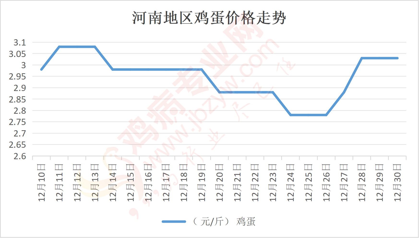 鸡病专业网消息:12月30日,河南郑州鸡蛋3.05元/斤,稳;新密鸡蛋3.05元/斤,稳;荥阳鸡蛋3.05元/斤,稳;中牟鸡蛋3.05元/斤,稳;周口鸡蛋3元/斤,稳;商丘鸡蛋91元/30斤,稳;鹤壁鸡蛋3元/斤,稳;汝州鸡蛋3元/斤,稳;开封鸡蛋91元/30斤,稳;漯河鸡蛋3元/斤,稳;漯河临颍鸡蛋3元/斤,稳;许昌鸡蛋3.05元/斤,稳;南阳鸡蛋3元/斤,稳;南阳邓州鸡蛋3元/斤,稳;新乡鸡蛋3元/斤,稳;安阳鸡蛋3元/斤,稳;新郑鸡蛋3.05元/斤,稳;登封鸡蛋3.05元/斤,稳;平顶山鸡蛋3.05元/斤,稳;驻马店鸡蛋3.05元/斤,稳;三门峡鸡蛋3.05元/斤,稳;焦作鸡蛋3元/斤,稳;信阳鸡蛋3元/斤,稳;濮阳鸡蛋3元/斤,稳。