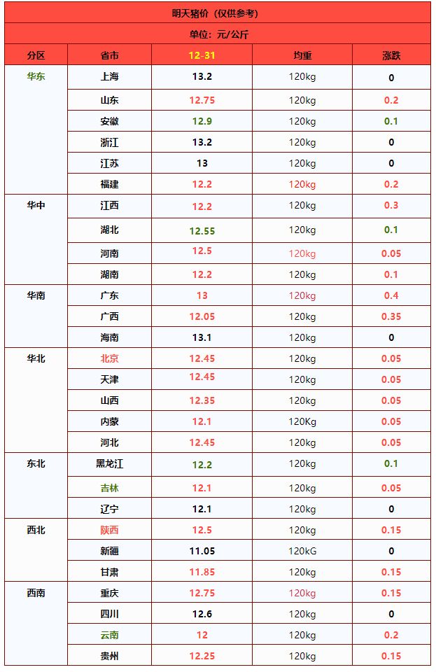 | 华北 | 北 京 | 12.43 | 12.40 | 0.24% | 元/KG |
