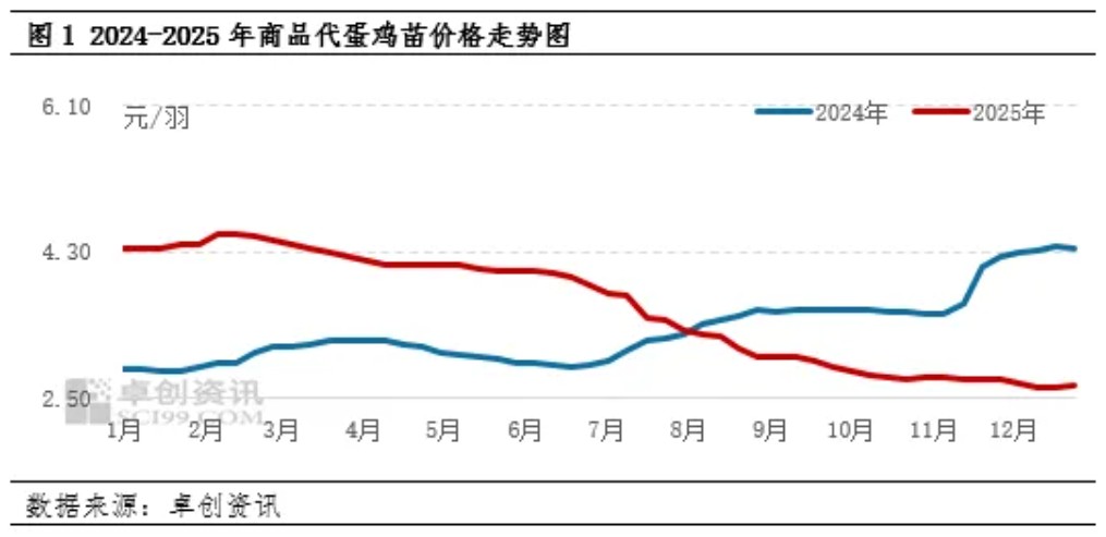 2025年四季度蛋鸡苗价格延续跌势,但季度均价环比跌幅较三季度显著收窄,其主要受鸡苗价格触底后下跌动能减弱与局部补栏需求对市场的微弱托举。2026年一季度随着春节前老鸡集中淘汰为产能腾出空间,以及节后传统“春雏”补栏季的到来,市场需求有望阶段性提振,进而拉动蛋鸡苗价格或小幅反弹。
