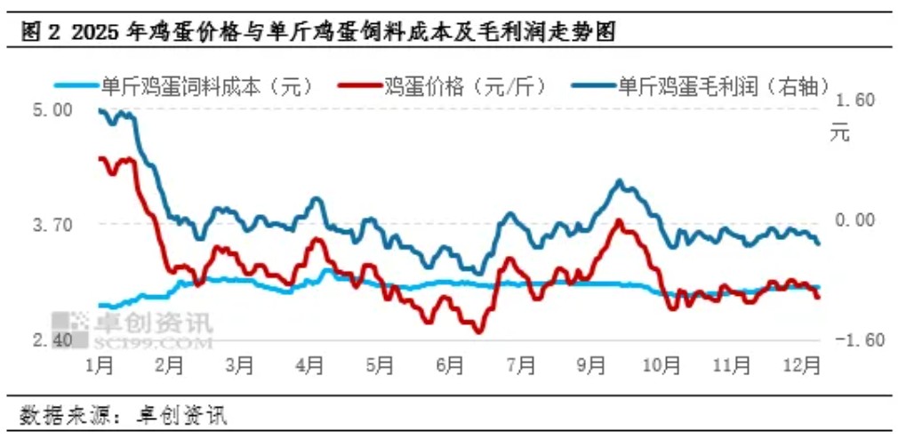 2025年中国蛋鸡产业面临严峻挑战,在产蛋鸡存栏量处于历史高位,鸡蛋价格长期处于弱势格局,多数时间蛋价运行于综合养殖成本以下,整个蛋鸡养殖行业持续处于亏损阶段,养殖利润欠佳,导致市场信心不足,补栏积极性受到抑制,年内蛋鸡苗整体呈现量价齐跌的趋势。进入四季度以后,蛋鸡苗价格整体延续下跌趋势,但下跌势头明显放缓。据卓创资讯监测数据显示,截至12月25日,四季度全国蛋鸡苗均价为2.72元/羽,环比跌幅16.56%,同比跌幅30.26%。从季度内的走势看,价格由季度初的2.84元/羽逐步下行至2.65元/羽,季度内跌幅为6.69%。这一跌幅显著低于三季度高达23.75%的下跌幅度,呈现出明显的“跌幅收窄”特征。