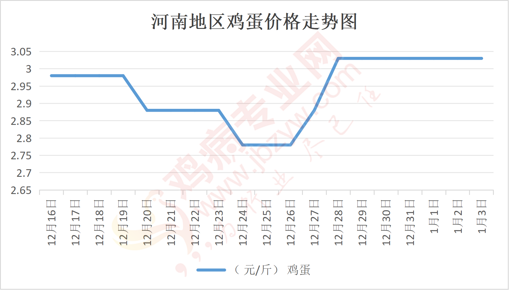 鸡病专业网消息:1月3日,河南郑州鸡蛋3.05元/斤,稳;新密鸡蛋3.05元/斤,稳;荥阳鸡蛋3.05元/斤,稳;中牟鸡蛋3.05元/斤,稳;周口鸡蛋3元/斤,稳;商丘鸡蛋91元/30斤,稳;鹤壁鸡蛋3元/斤,稳;汝州鸡蛋3元/斤,稳;开封鸡蛋91元/30斤,稳;漯河鸡蛋3元/斤,稳;漯河临颍鸡蛋3元/斤,稳;许昌鸡蛋3.05元/斤,稳;南阳鸡蛋3元/斤,稳;南阳邓州鸡蛋3元/斤,稳;新乡鸡蛋3元/斤,稳;安阳鸡蛋3元/斤,稳;新郑鸡蛋3.05元/斤,稳;登封鸡蛋3.05元/斤,稳;平顶山鸡蛋3.05元/斤,稳;驻马店鸡蛋3.05元/斤,稳;三门峡鸡蛋3.05元/斤,稳;焦作鸡蛋3元/斤,稳;信阳鸡蛋3元/斤,稳;濮阳鸡蛋3元/斤,稳。
