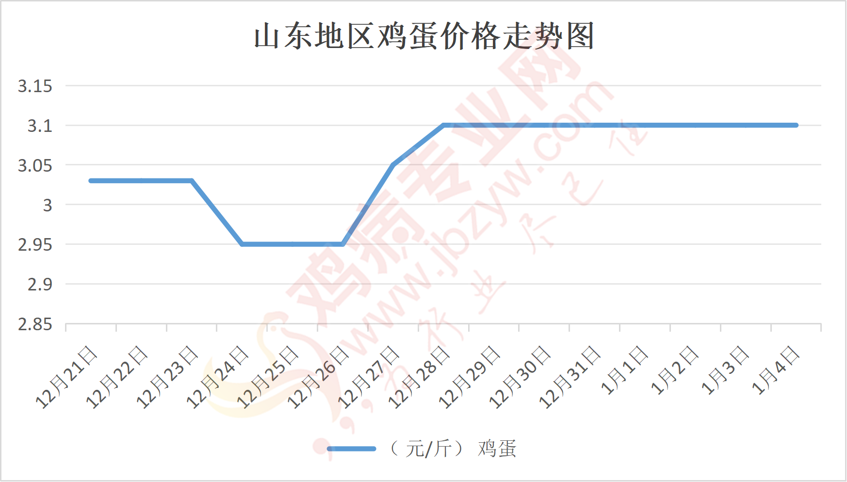 鸡病专业网消息:1月4日,山东地区莱阳鸡蛋3.15元/斤,稳;青岛鸡蛋3.15元/斤,稳;诸城鸡蛋3.15元/斤,稳;安丘鸡蛋3.05元/斤,稳;昌乐鸡蛋3.05元/斤,稳;寿光鸡蛋3.05元/斤,稳;昌邑鸡蛋3.05元/斤,稳;高密鸡蛋3.15元/斤,稳;青州鸡蛋3.05元/斤,稳;临朐鸡蛋3.05元/斤,稳;莱州鸡蛋3.15元/斤,稳;威海鸡蛋3.15元/斤,稳;临沭鸡蛋3.1元/斤,稳;沂水鸡蛋3.1元/斤,稳;沂南鸡蛋3.1元/斤,稳;莒南鸡蛋3.1元/斤,稳;兰陵县鸡蛋3.1元/斤,稳;日照鸡蛋3.1元/斤,稳;莒县鸡蛋3.1元/斤,稳;日照辛萁商贸鸡蛋3.1元/斤,稳;泗水鸡蛋价格90元/斤,稳;济宁、汶上鸡蛋价格90元/斤,稳;梁山、东平红蛋价格90元/斤,稳;枣庄滕州地区鸡蛋混码主流到户90元/30斤,稳;泰安地区新泰鸡蛋价格90元/斤,稳;菏泽地区曹县主流到户90元/斤,稳;成武鸡蛋价格90元/斤,稳;单县到户90元/斤,稳;聊城莘县90元/斤,稳。