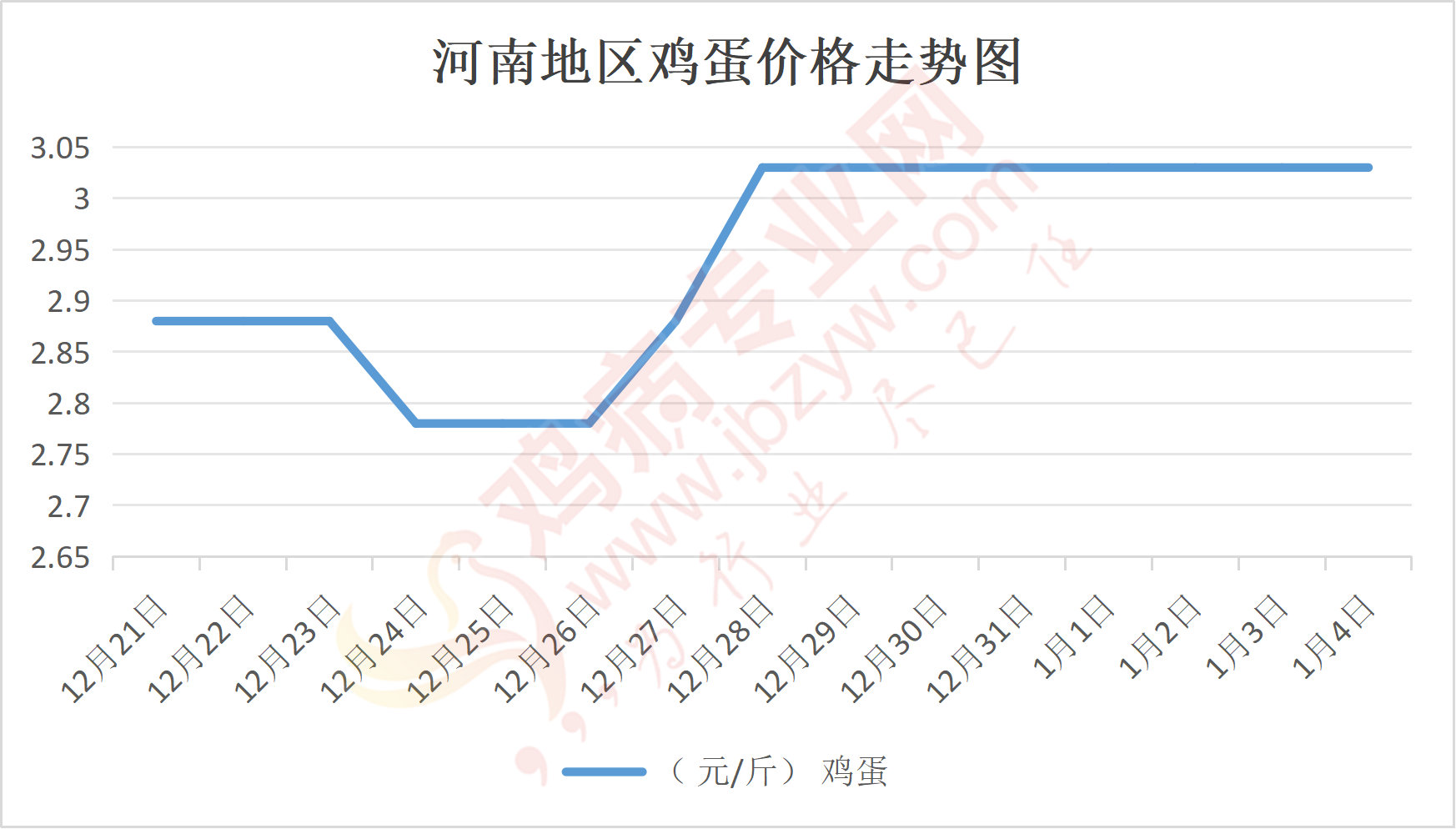 鸡病专业网消息:1月4日,河南郑州鸡蛋3.05元/斤,稳;新密鸡蛋3.05元/斤,稳;荥阳鸡蛋3.05元/斤,稳;中牟鸡蛋3.05元/斤,稳;周口鸡蛋3元/斤,稳;商丘鸡蛋91元/30斤,稳;鹤壁鸡蛋3元/斤,稳;汝州鸡蛋3元/斤,稳;开封鸡蛋91元/30斤,稳;漯河鸡蛋3元/斤,稳;漯河临颍鸡蛋3元/斤,稳;许昌鸡蛋3.05元/斤,稳;南阳鸡蛋3元/斤,稳;南阳邓州鸡蛋3元/斤,稳;新乡鸡蛋3元/斤,稳;安阳鸡蛋3元/斤,稳;新郑鸡蛋3.05元/斤,稳;登封鸡蛋3.05元/斤,稳;平顶山鸡蛋3.05元/斤,稳;驻马店鸡蛋3.05元/斤,稳;三门峡鸡蛋3.05元/斤,稳;焦作鸡蛋3元/斤,稳;信阳鸡蛋3元/斤,稳;濮阳鸡蛋3元/斤,稳。