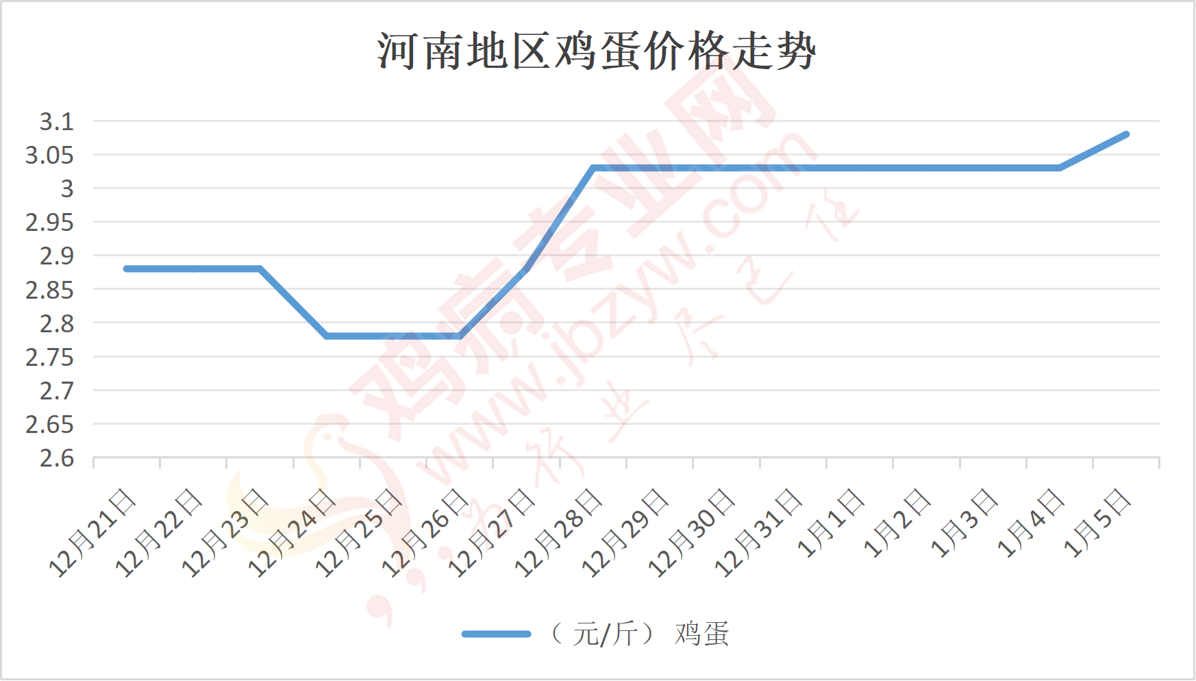 鸡病专业网消息:1月5日,河南郑州鸡蛋3.1元/斤,涨;新密鸡蛋3.1元/斤,涨;荥阳鸡蛋3.1元/斤,涨;中牟鸡蛋3.1元/斤,涨;周口鸡蛋3.05元/斤,涨;商丘鸡蛋92元/30斤,涨;鹤壁鸡蛋3.05元/斤,涨;汝州鸡蛋3.05元/斤,涨;开封鸡蛋91-92元/30斤,涨;漯河鸡蛋3.05元/斤,涨;漯河临颍鸡蛋3.05元/斤,涨;许昌鸡蛋3.1元/斤,涨;南阳鸡蛋3.05元/斤,涨;南阳邓州鸡蛋3.05元/斤,涨;新乡鸡蛋3.05元/斤,涨;安阳鸡蛋3.05元/斤,涨;新郑鸡蛋3.1元/斤,涨;登封鸡蛋3.1元/斤,涨;平顶山鸡蛋3.1元/斤,涨;驻马店鸡蛋3.1元/斤,涨;三门峡鸡蛋3.1元/斤,涨;焦作鸡蛋3.05元/斤,涨;信阳鸡蛋3.05元/斤,涨;濮阳鸡蛋3.05元/斤,涨。