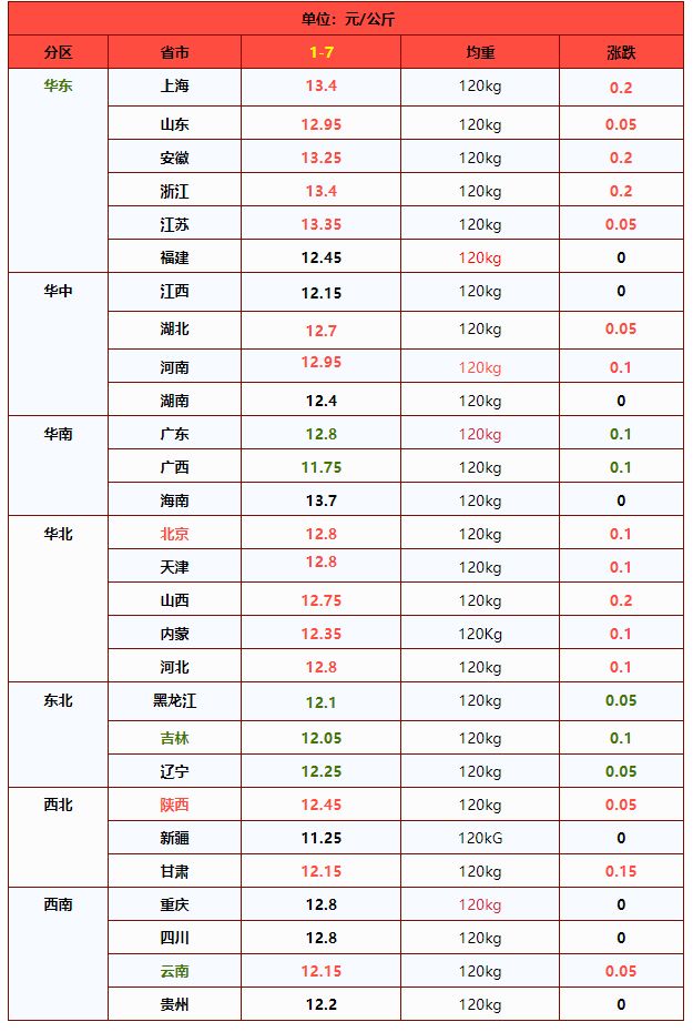 | 华南 | 广东省 | 12.90 | 13.01 | -0.85% | 元/KG |