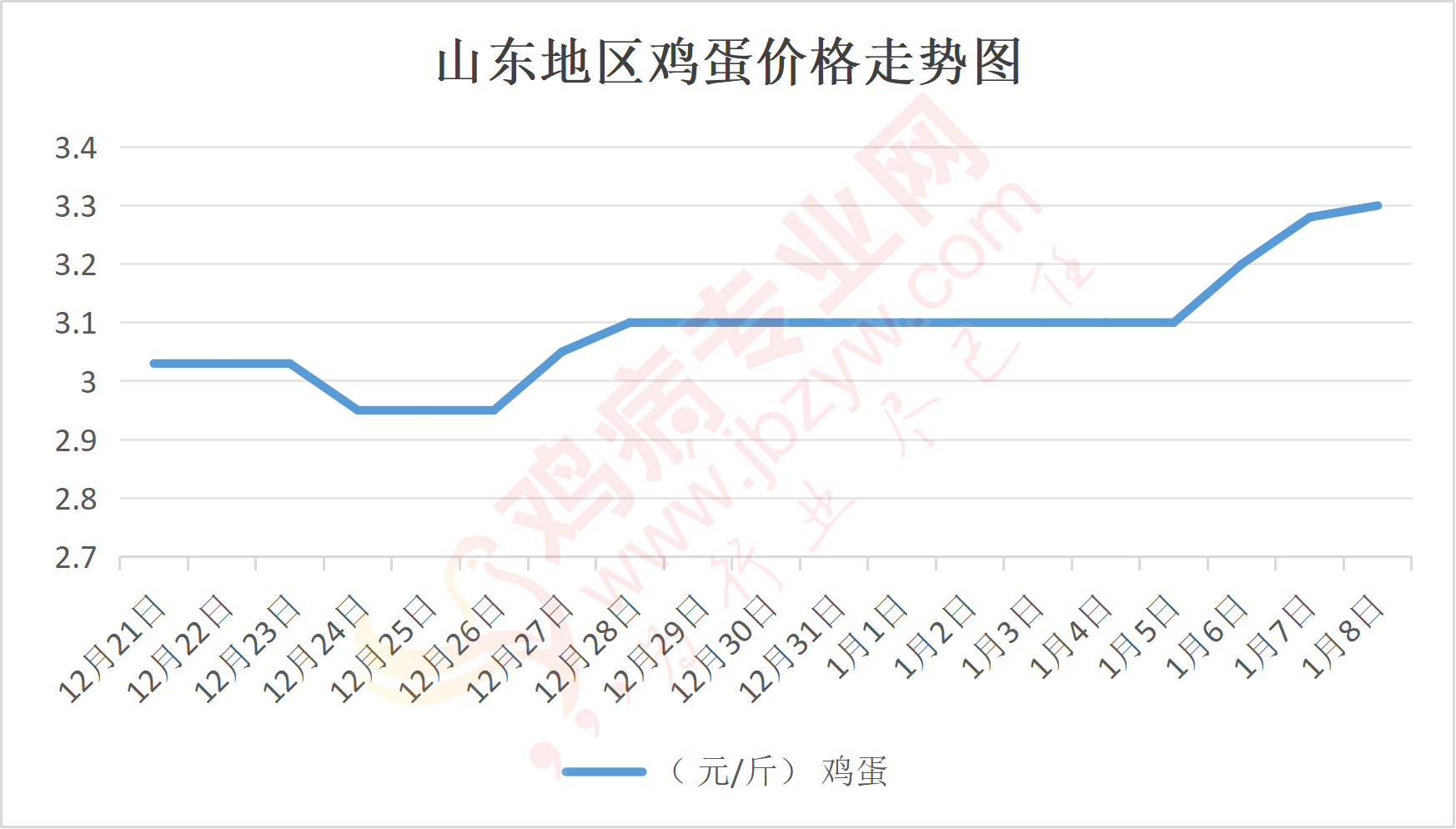 鸡病专业网消息:1月8日,山东地区莱阳鸡蛋3.35元/斤,涨;青岛鸡蛋3.35元/斤,涨;诸城鸡蛋3.35元/斤,涨;安丘鸡蛋3.25元/斤,稳;昌乐鸡蛋3.25元/斤,稳;寿光鸡蛋3.25元/斤,稳;昌邑鸡蛋3.25元/斤,稳;高密鸡蛋3.35元/斤,涨;青州鸡蛋3.25元/斤,稳;临朐鸡蛋3.25元/斤,稳;莱州鸡蛋3.35元/斤,涨;威海鸡蛋3.35元/斤,涨;临沭鸡蛋3.25元/斤,稳;沂水鸡蛋3.25元/斤,稳;沂南鸡蛋3.25元/斤,稳;莒南鸡蛋3.25元/斤,稳;兰陵县鸡蛋3.25元/斤,稳;日照鸡蛋3.25元/斤,稳;莒县鸡蛋3.25元/斤,稳;日照辛萁商贸鸡蛋3.25元/斤,稳;泗水鸡蛋价格97元/斤,稳;济宁、汶上鸡蛋价格97元/斤,稳;梁山、东平红蛋价格97元/斤,稳;枣庄滕州地区鸡蛋混码主流到户98元/30斤,稳;泰安地区新泰鸡蛋价格97元/斤,稳;菏泽地区曹县主流到户97元/斤,稳;成武鸡蛋价格97元/斤,稳;单县到户97元/斤,稳;聊城莘县97元/斤,稳;莱芜鸡蛋145元/45斤,稳;济南鸡蛋145元/45斤,稳;德州鸡蛋128元/40斤,稳;滨州鸡蛋128元/30斤,稳。