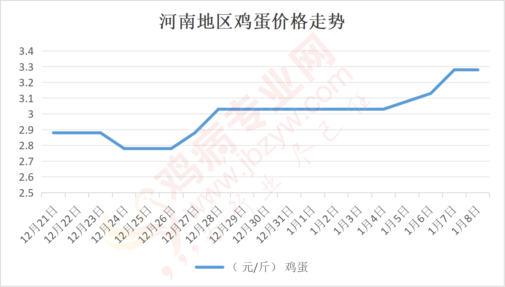 鸡病专业网消息:1月8日,河南郑州鸡蛋3.3元/斤,稳;新密鸡蛋3.3元/斤,稳;荥阳鸡蛋3.3元/斤,稳;中牟鸡蛋3.3元/斤,稳;周口鸡蛋3.25元/斤,稳;商丘鸡蛋98元/30斤,稳;鹤壁鸡蛋3.25元/斤,稳;汝州鸡蛋3.25元/斤,稳;开封鸡蛋97-98元/30斤,稳;漯河鸡蛋3.25元/斤,稳;漯河临颍鸡蛋3.25元/斤,稳;许昌鸡蛋3.3元/斤,稳;南阳鸡蛋3.25元/斤,稳;南阳邓州鸡蛋3.25元/斤,稳;新乡鸡蛋3.25元/斤,稳;安阳鸡蛋3.25元/斤,稳;新郑鸡蛋3.3元/斤,稳;登封鸡蛋3.3元/斤,稳;平顶山鸡蛋3.3元/斤,稳;驻马店鸡蛋3.3元/斤,稳;三门峡鸡蛋3.3元/斤,稳;焦作鸡蛋3.25元/斤,稳;信阳鸡蛋3.25元/斤,稳;濮阳鸡蛋3.25元/斤,稳。