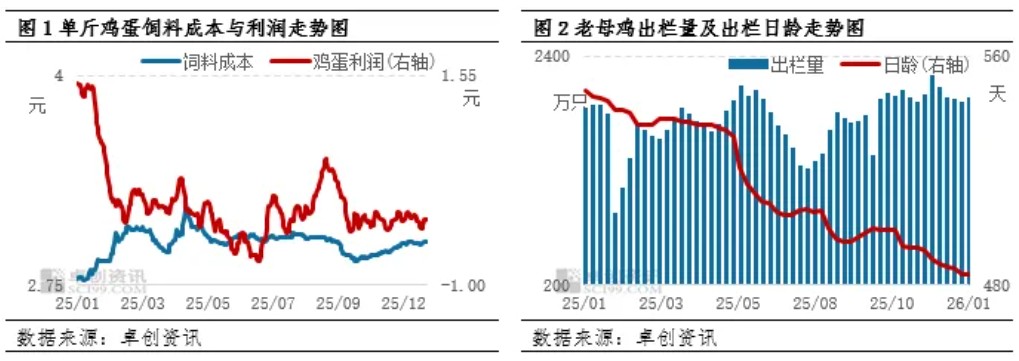 在过去蛋鸡养殖业发展的过程中,养殖单位习惯于鸡蛋价格的季节性波动规律,结合蛋鸡正常生长周期,一般在春节前、中秋后积极出栏大日龄低产能的老母鸡,在3-5月份积极补栏新鸡苗。虽春节传统出栏时间点尚未正式开启,因单斤鸡蛋利润由持续亏损,产区养殖单位为减少亏损,局部出现明显提前出栏的心态,积极出栏产蛋率不高的适龄蛋鸡,截至2025年12月底,老母鸡出栏日龄较上月底提前5天,农贸市场及屠宰端正常开工收鸡,全国老母鸡市场出栏量环比增幅超1%,蛋鸡行业启程“去产能”之旅,但实际去产能速度可能慢于预期。