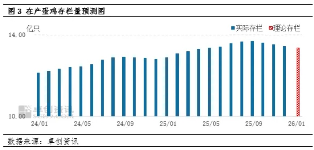 2026年1月新开产的蛋鸡主要是9月前后补栏的鸡苗,此阶段养殖单位补栏积极性不高,鸡苗月度销量环比减幅超1.5%,因此1月进入开产期的蛋鸡数量或继续减少。老母鸡方面,根据老母鸡日龄及鸡苗销量推算,2026年1月理论待淘老母鸡数量或环比增加,叠加养殖单位为避免春节后低迷行情,节前多有季节性淘汰需求,故预计1月出栏量或呈增加趋势。综合来看,1月新开产蛋鸡数量或小于淘汰鸡出栏量,预计在产蛋鸡存栏量或延续微幅减少的趋势,环比减幅或仍低于1%。鸡蛋供应量持续下降,加之临近春节,食品厂采购量增加,下游备货积极性提升,市场需求好转,市场供需关系收紧,期末库存预估值下降,对鸡蛋行情形成支撑。