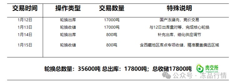 这次中央储备冻猪肉交易不是单一动作,而是“出库+收储”交替进行的轮换操作,精准覆盖1月中旬关键节点,交易总量达35600吨,具体安排如下: