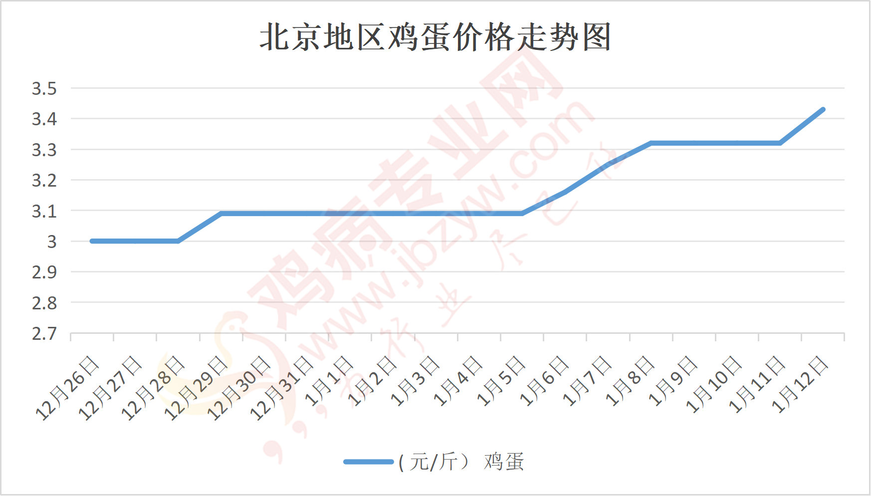 鸡病专业网消息:1月12日,北京大洋路鸡蛋主流批发价格151-152元/44斤,涨,到货5台车,成交灵活,走货正常;回龙观鸡蛋151元/44斤,涨;顺义石门鸡蛋151元/44斤,涨。