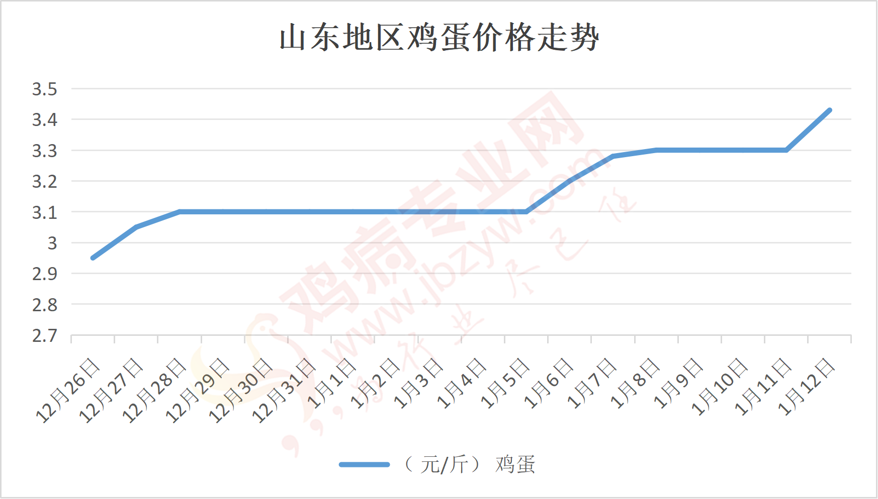 鸡病专业网消息:1月12日,山东地区莱阳鸡蛋3.45元/斤,涨;青岛鸡蛋3.45元/斤,涨;诸城鸡蛋3.45元/斤,涨;安丘鸡蛋3.4元/斤,涨;昌乐鸡蛋3.4元/斤,涨;寿光鸡蛋3.4元/斤,涨;昌邑鸡蛋3.4元/斤,涨;高密鸡蛋3.45元/斤,涨;青州鸡蛋3.4元/斤,涨;临朐鸡蛋3.4元/斤,涨;莱州鸡蛋3.45元/斤,涨;威海鸡蛋3.45元/斤,涨;临沭鸡蛋3.4元/斤,涨;沂水鸡蛋3.4元/斤,涨;沂南鸡蛋3.4元/斤,涨;莒南鸡蛋3.4元/斤,涨;兰陵县鸡蛋3.4元/斤,涨;日照鸡蛋3.4元/斤,涨;莒县鸡蛋3.4元/斤,涨;日照辛萁商贸鸡蛋3.4元/斤,涨;泗水鸡蛋价格101元/斤,涨;济宁、汶上鸡蛋价格101元/斤,涨;梁山、东平红蛋价格101元/斤,涨;枣庄滕州地区鸡蛋混码主流到户102元/30斤,涨;泰安地区新泰鸡蛋价格101元/斤,涨;菏泽地区曹县主流到户101元/斤,涨;成武鸡蛋价格101元/斤,涨;单县到户101元/斤,涨;聊城莘县101元/斤,涨;莱芜鸡蛋150元/45斤,涨;济南鸡蛋150元/45斤,涨;德州鸡蛋132元/40斤,涨;滨州鸡蛋132元/30斤,涨。