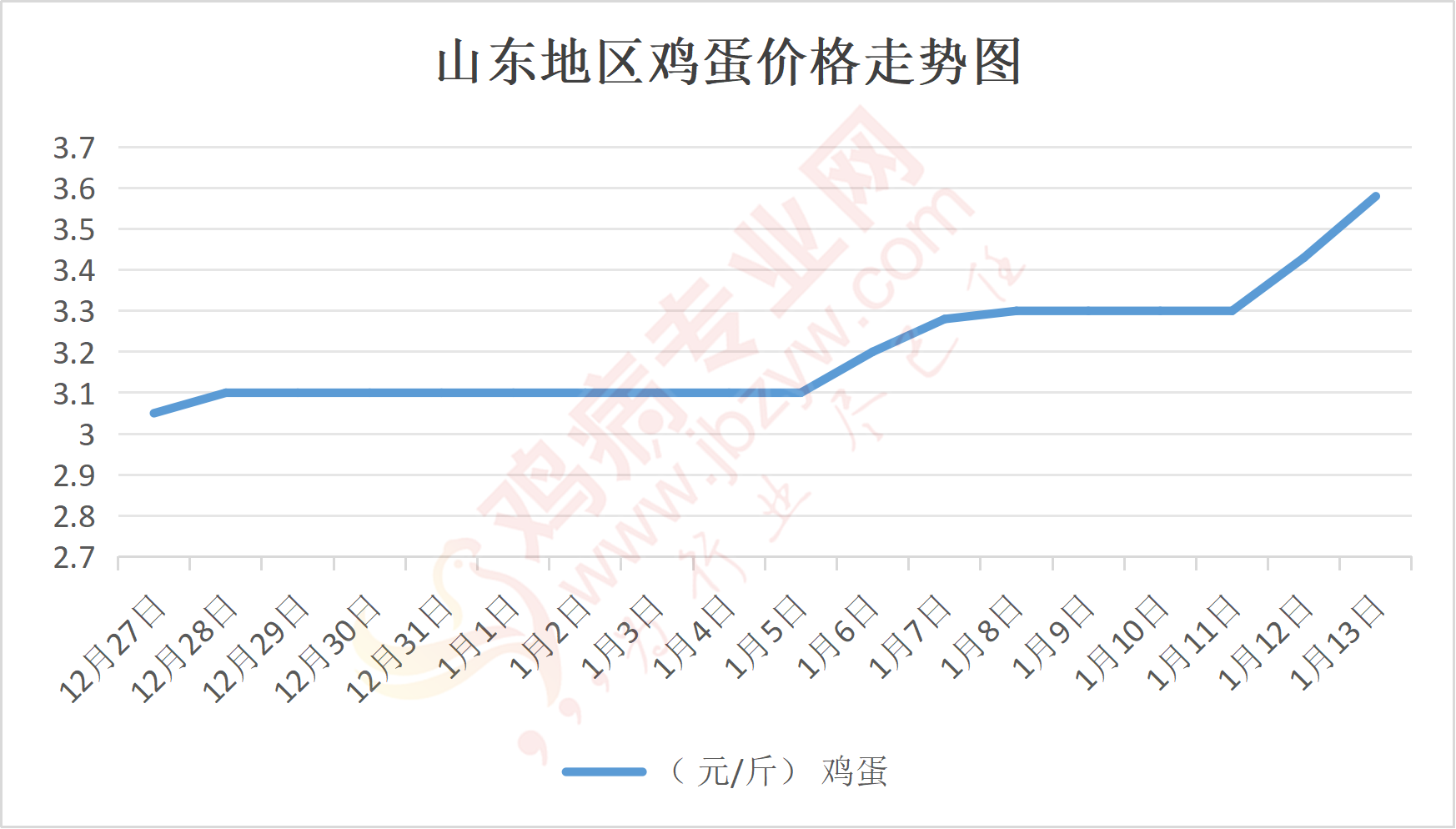 鸡病专业网消息:1月13日,山东地区莱阳鸡蛋3.55元/斤,涨;青岛鸡蛋3.55元/斤,涨;诸城鸡蛋3.6元/斤,涨;安丘鸡蛋3.55元/斤,涨;昌乐鸡蛋3.55元/斤,涨;寿光鸡蛋3.55元/斤,涨;昌邑鸡蛋3.55元/斤,涨;高密鸡蛋3.6元/斤,涨;青州鸡蛋3.55元/斤,涨;临朐鸡蛋3.55元/斤,涨;莱州鸡蛋3.55元/斤,涨;威海鸡蛋3.55元/斤,涨;临沭鸡蛋3.55元/斤,涨;沂水鸡蛋3.55元/斤,涨;沂南鸡蛋3.55元/斤,涨;莒南鸡蛋3.55元/斤,涨;兰陵县鸡蛋3.55元/斤,涨;日照鸡蛋3.55元/斤,涨;莒县鸡蛋3.55元/斤,涨;日照辛萁商贸鸡蛋3.55元/斤,涨;泗水鸡蛋价格105元/30斤,涨;济宁、汶上鸡蛋价格105元/30斤,涨;梁山、东平红蛋价格105元/30斤,涨;枣庄滕州地区鸡蛋混码主流到户106元/30斤,涨;泰安地区新泰鸡蛋价格105元/30斤,涨;菏泽地区曹县主流到户105元/30斤,涨;成武鸡蛋价格105元/30斤,涨;单县到户105元/30斤,涨;聊城莘县105元/30斤,涨;莱芜鸡蛋158元/45斤,涨;济南鸡蛋158元/45斤,涨;德州鸡蛋140元/40斤,涨;滨州鸡蛋140元/40斤,涨。