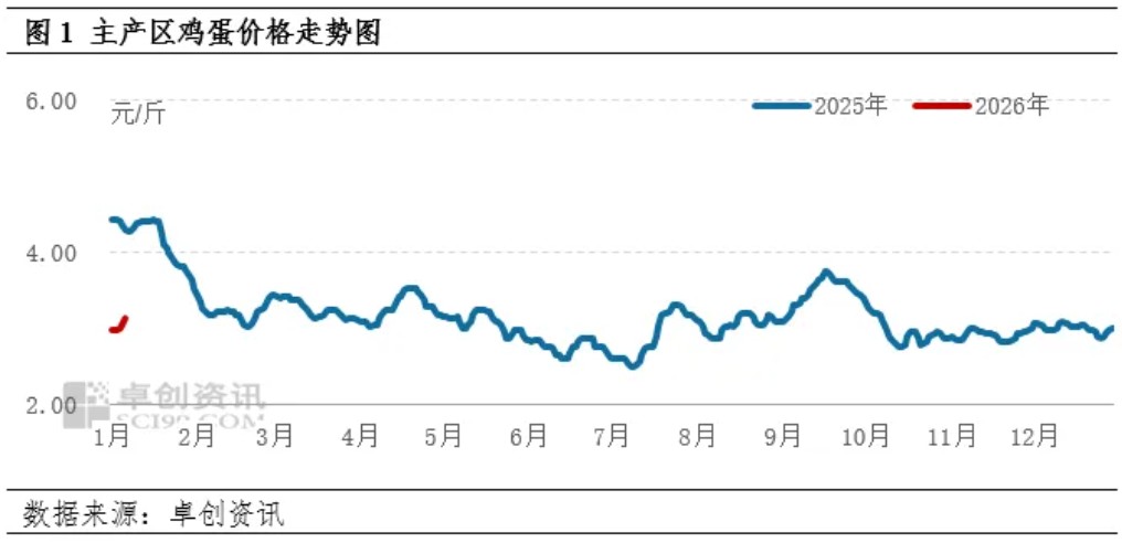 存栏微降,供应压力略有缓解。1月份新开产蛋鸡是2025年9月份补栏的鸡苗,此阶段养殖盈利欠佳,养殖企业补栏积极性不高,因此1月份新开产蛋鸡数量环比减少。老母鸡出栏方面,养殖企业大多计划春节前出栏老鸡,1月老母鸡出栏量或增加。综合来看,1月份老母鸡出栏量大于新开产蛋鸡数量,在产蛋鸡存栏量小幅下滑,预计1月份在产蛋鸡存栏量理论值或在13.34亿只左右,环比下降0.74%。存栏量微降,鸡蛋供应压力缓解。