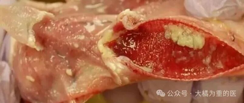 2、急性期(3–5 d):① 伸颈张口呼吸,发出“咯咯”喘鸣音② 突然咯血:甩出带血黏液条,笼壁、水槽见血条③ 冠髯发绀,体温升高 1–1.5 ℃;