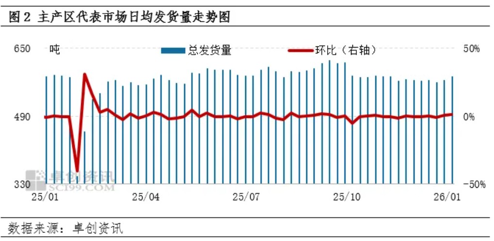 需求增量是蛋价走高的核心驱动。随着春节临近,食品企业为春节备货,鸡蛋采购量增加。春节前蛋价易涨难跌,下游贸易商参市积极性提升,鸡蛋采购量增加。据卓创资讯监测,1月份第1周主产区代表市场日均发货量为582.68吨,环比增幅1.49%。