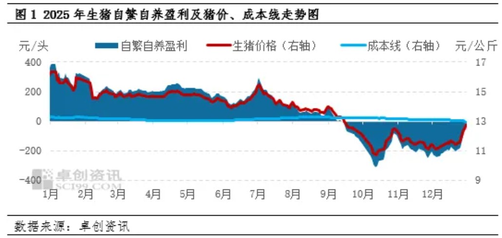 2025年生猪自繁自养盈利呈现上半年较为平稳、下半年先降后回暖的态势。而经过2025年12月末的快速反弹后,自繁自养模式在1月中旬再度迎来微幅盈利的情况。就当前的最新产能情况来看,2026年生猪行情虽仍可能呈先跌后涨态势,但转折点或再度推后,下半年上涨幅度亦或受限。在猪价的影响下,生猪自繁自养盈利或在盈亏线附近徘徊,年末或再度回归至盈利状态。