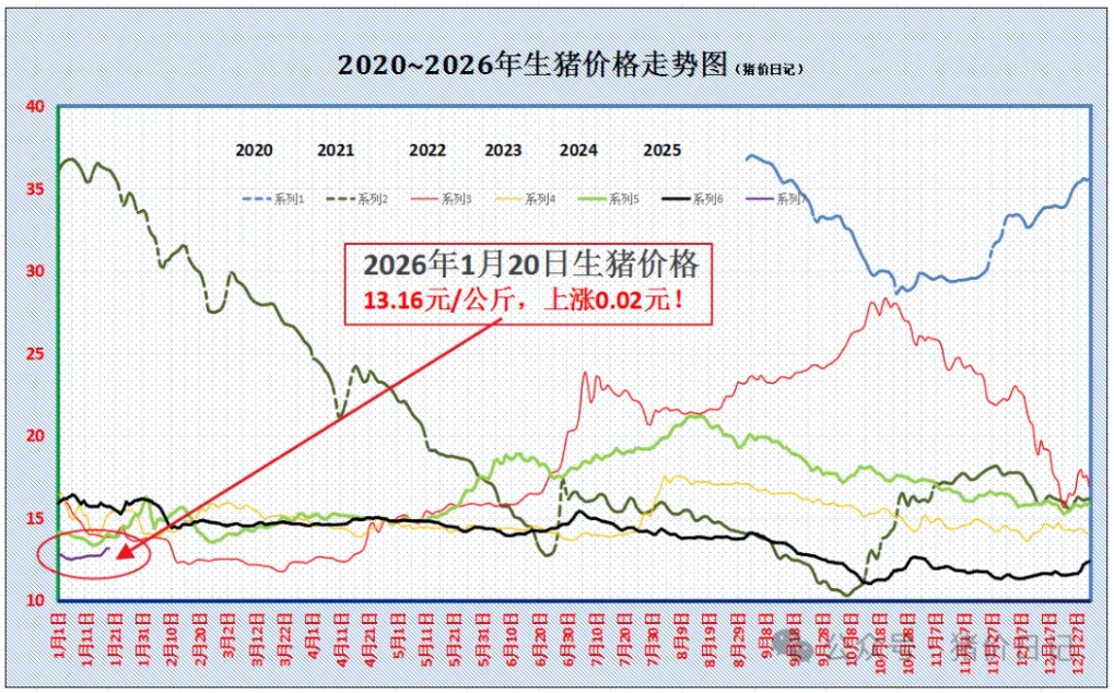 2026年1月19日,中国主流市场出栏外三元、内三元及土杂商品大猪加权日均价较昨日价格上涨,全国生猪出栏加权日均价13.14每公斤,较昨日价格上涨1.22%。北方出栏情绪出现分化,散户出栏积极性差,部分地区集团随涨价增量出栏;另外部分二育省份有少量二次育肥补栏。南方市场猪价稳中有涨。近期受大猪消费支撑,带动西南,华南等地区标猪走货好转,加之江西二育补栏情绪略增,带动价格上涨。但屠企反馈连日上涨后终端跟进不足,预计近期猪价或逐步回调,关注市场走货及市场情绪。整体来看,中旬后,生猪出栏随着降温逐步积极,全国出栏均重继续环比下滑,持续跟进后续临近春节带来的消费端边际变化,一季度供给或仍面临较大压力。今日全国外三元、内三元及土杂猪均价如下:1) 主流市场外三元大猪全国销售均13.24元每公斤,较昨天价格上涨1.16%;2)主流市场内三元大猪全国销售均价12.88元每公斤,较昨天价格上涨1.45%;3)主流市场土杂大猪全国销售均价12.48元每公斤,较昨天价格上涨1.24%。