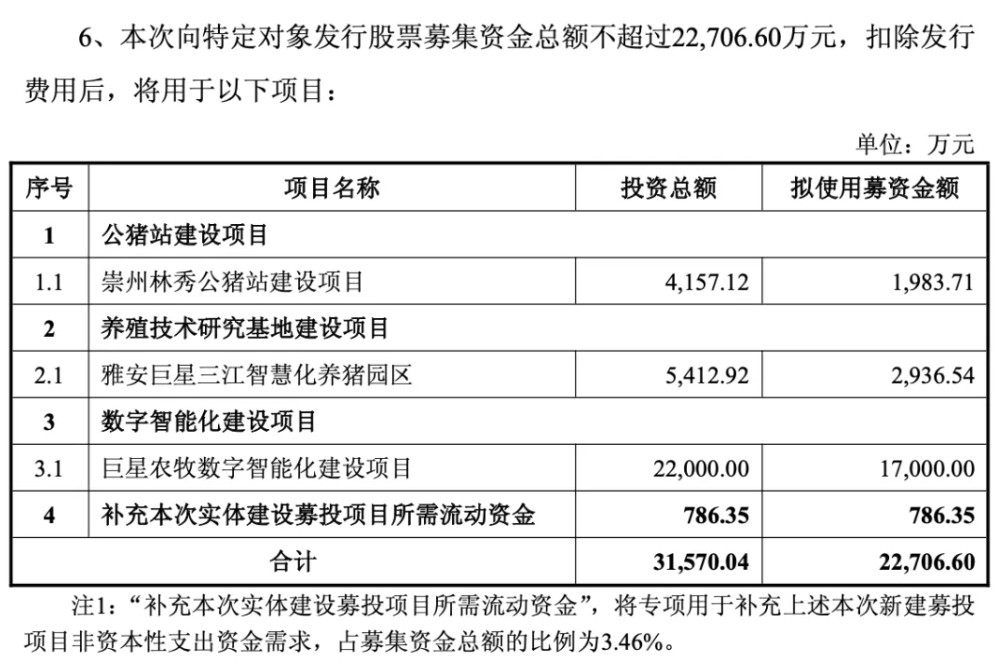 1月8日,巨星农牧召开第五届董事会第四次会议,审议通过《2023年度向特定对象发行股票方案》的调整议案,向特定对象发行股票的募集资金总额上限由原计划的不超过8亿元,调整为不超过2.27亿元。而23年方案刚提出时,募资金额为不超过17.5亿元。