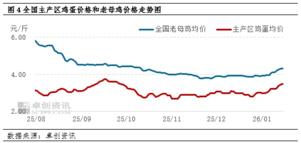 一方面,2026年1月鸡蛋市场呈现价格与饲料成本同步上涨的态势,但鸡蛋价格涨幅显著高于饲料成本,推动蛋鸡养殖效益由亏转盈。据卓创资讯监测数据显示,1月1-15日,鸡蛋价格累计上涨16.72%,而饲料价格仅上涨0.53%,蛋价幅度远超饲料价格涨幅,使得月内蛋鸡养殖扭亏为盈,行业重新进入盈利周期。这一盈利改善显著提振了养殖户信心,惜售情绪随之明显升温,市场供应节奏放缓。