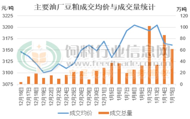 目前离春节还有不到一个月的时间,在这时间段内生猪及肉鸡存栏均处于一年中的偏高水平,而牛羊等的育肥工作也持续进行,导致饲料及养殖场对豆粕的需求较大,油厂豆粕出货数量略高于豆粕产量后,豆粕库存处于下降的趋势。据饲料行业网统计,自元旦以来国内油厂豆粕单日成交数量大部分时间都在20万吨以上的水平,特别是进入中旬以来出现多次成交放量的情况,如此旺盛的市场需求对豆粕价格提供支撑。
