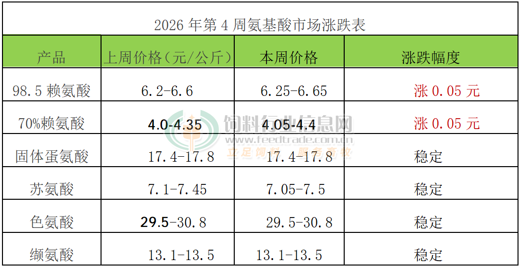 赖氨酸市场中,98%赖氨酸参考报价区间6.25-6.65元/公斤,70%赖氨酸参考报价区间4.05-4.4元/公斤。2025年12月,我国赖氨酸与赖氨酸盐及酯的出口量为9.8万吨,同比增0.4%,环比增8.4%。万里润达氨基酸生产线计划近日阶段性升级检修。出口量回升,且原料玉米价格有所上涨,近日部分赖氨酸厂家报价上调50-100元/吨,赖氨酸市场稳中偏强,成交小幅上行。