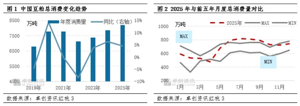 在过去的2025年,豆粕市场在供应宽松背景下,价格重心承压下移,下游畜禽存栏高位水平叠加性价比优势凸显使得豆粕消费量数据呈现增加态势。展望2026年,全球大豆供应呈现进一步增加预期,不考虑中美贸易往来出现其他变数下,卓创资讯预计豆粕消费量将保持增长态势,但增速或进一步放缓。