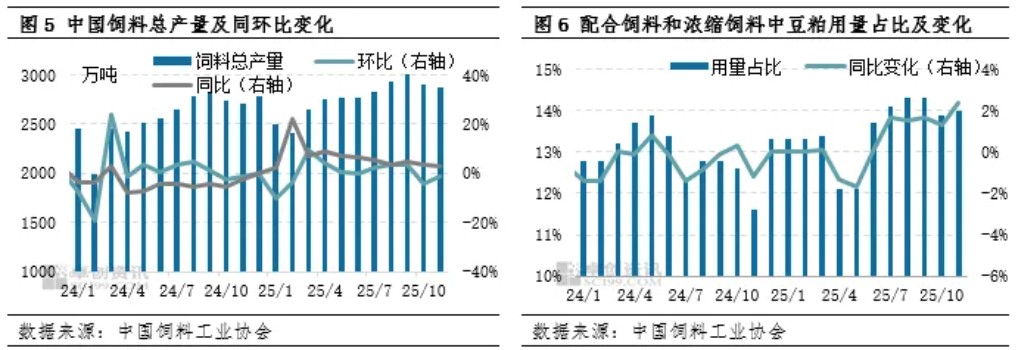 饲料产量方面,根据中国饲料工业协会数据统计显示,截至11月,2025年饲料总产量30434万吨,同比增加8.34%。其中配合饲料和浓缩饲料中豆粕用量占比较去年同期提升0.59个百分点,下半年添加比例多数月份均处于14%以上的高位水平运行。结合存栏数据高位运行以及添加比例增加,给与国内豆粕消费量增加奠定了坚实的基础。