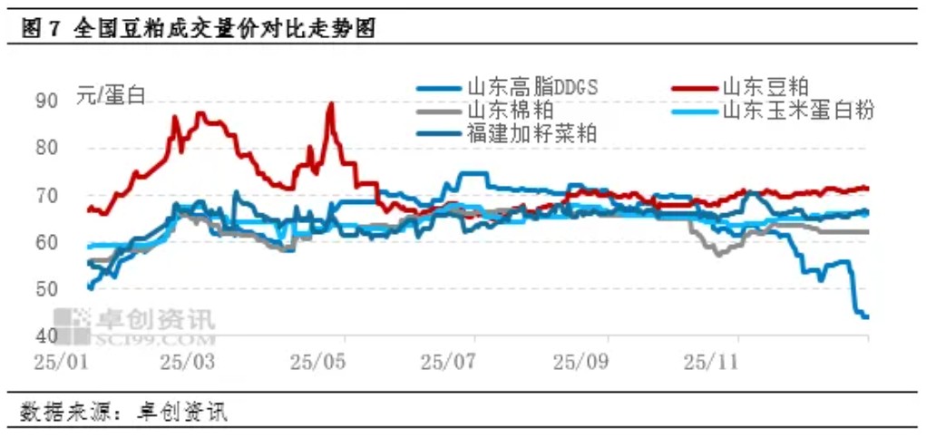 得益于原料宽松供应的大背景下,2025年豆粕价格重心呈现下移态势,整体走势呈现前高后低态势。1-4月价格上涨背后驱动主要自于国内原料出现阶段性供应紧张局面,导致豆粕现货也随之出现阶段性供应紧张局面,豆粕较其他蛋白饲料价差出现明显走扩趋势,5月后国内豆粕供应恢复宽松局面,豆粕较其他蛋白饲料价差逐步收窄,其中三季度豆粕与棉粕、DDGS、蛋白粉单蛋白出现价格倒挂情况,豆粕性价比优势得以显现,也是导致豆粕消费量增加的重要因素之一。