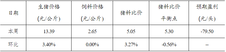 生猪方面,未来仔猪育肥模式的生猪养殖头均亏损79.5元。