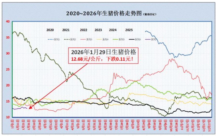 从生猪供需基本面来看,目前,国内猪价承压,市场以盘整偏弱为主,受供需博弈,预计,1月29日,外三元瘦肉型标猪报价下跌0.11元/公斤,标猪报价回落至12.68元/公斤左右!