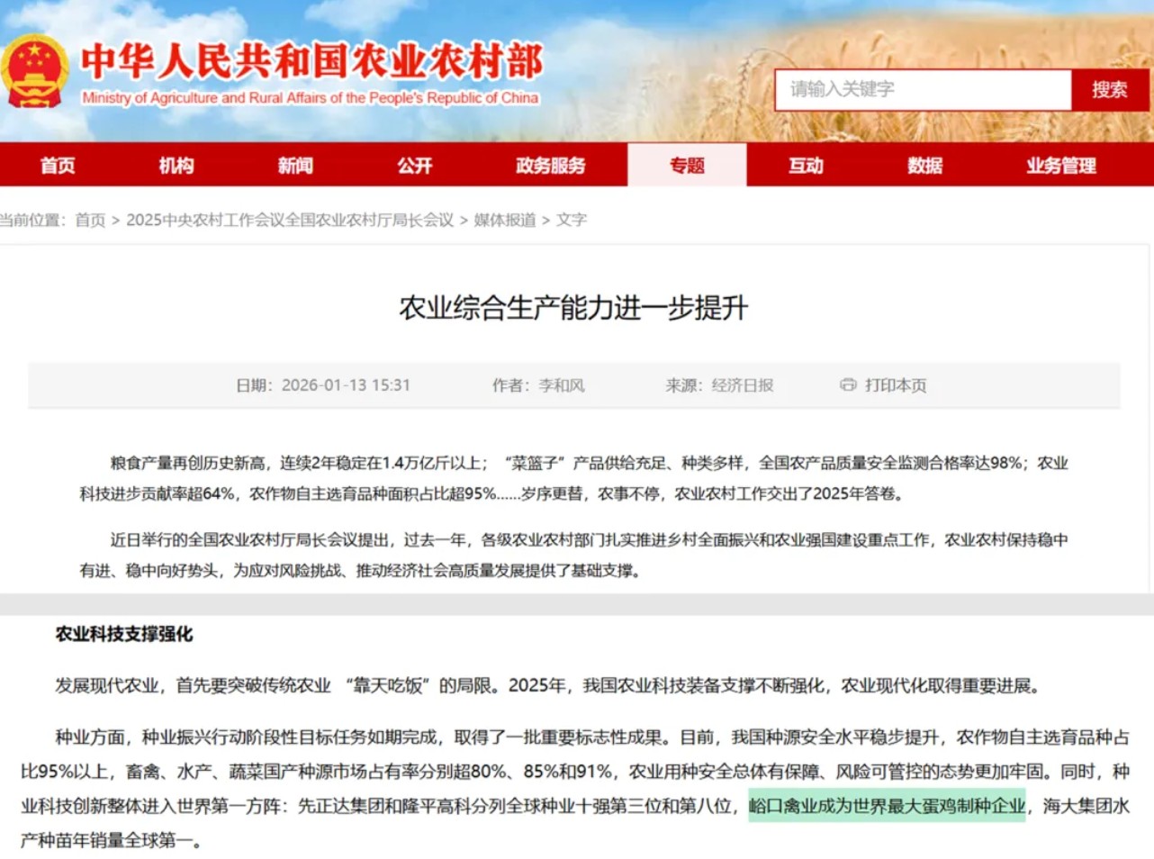 2025年,种业振兴行动取得了一批重要标志性成果,其中峪口禽业成为世界最大蛋鸡制种企业。