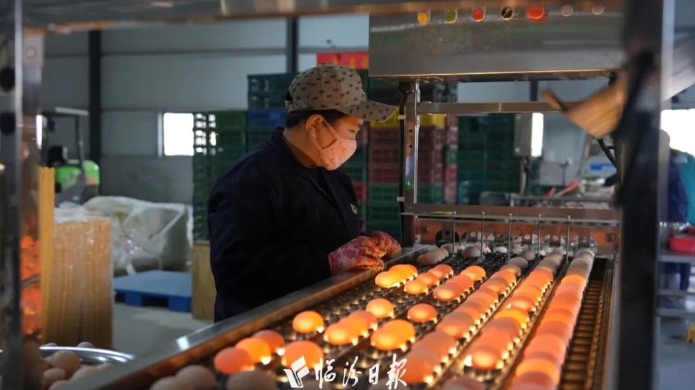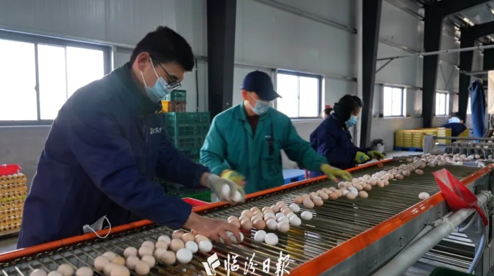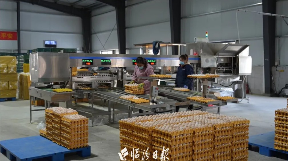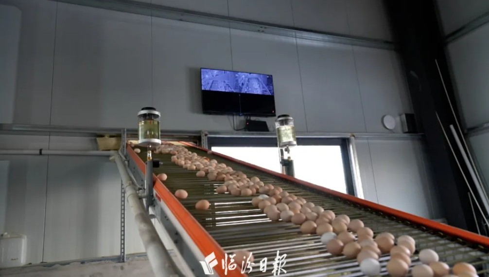 蛋库里,又是另一番繁忙而有序的景象。几名工人站在捡蛋生产线两侧,默契配合,有的细心挑出裂纹蛋,有的将装满鸡蛋的蛋托整齐码放。“捡蛋线上的视觉计数系统能精准统计日产量,光检功能把品质差的鸡蛋挑选出来,末端还能给鸡蛋称重分类,太省心了。”郑亚军指着生产线介绍,如今,存栏33万羽蛋鸡,其中22万羽已顺利进入产蛋期,每天能产1万公斤鲜蛋,而且当天的鸡蛋就能进入本地及太原、西安、榆林等地的市场。