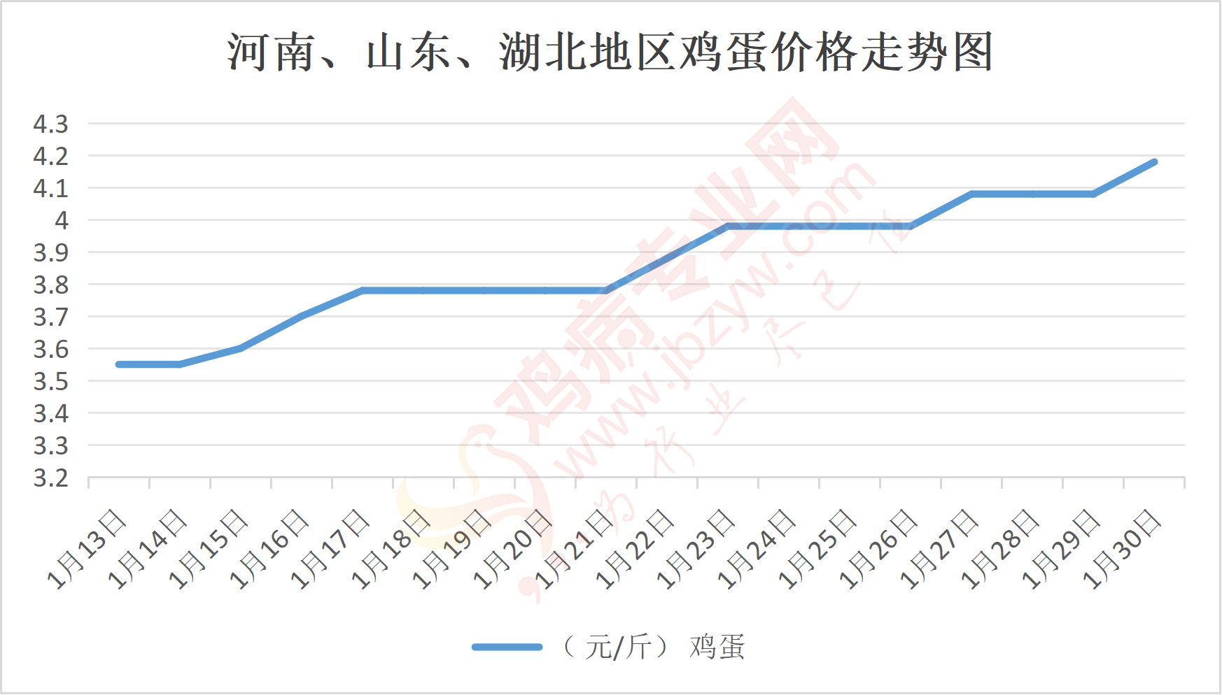 鸡病专业网消息:1月30日,河南郑州鸡蛋4.2元/斤,涨;新密鸡蛋4.2元/斤,涨;荥阳鸡蛋4.2元/斤,涨;中牟鸡蛋4.2元/斤,涨;周口鸡蛋4.2元/斤,涨;商丘鸡蛋123元/30斤,涨;鹤壁鸡蛋4.2元/斤,涨;汝州鸡蛋4.2元/斤,涨;开封鸡蛋123元/30斤,涨;漯河鸡蛋4.15元/斤,涨;漯河临颍鸡蛋4.2元/斤,涨;许昌鸡蛋4.2元/斤,涨;南阳鸡蛋4.2元/斤,涨;南阳邓州鸡蛋4.2元/斤,涨;新乡鸡蛋4.15元/斤,涨;安阳鸡蛋4.15元/斤,涨;新郑鸡蛋4.2元/斤,涨;登封鸡蛋4.2元/斤,涨;平顶山鸡蛋4.2元/斤,涨;驻马店鸡蛋4.15元/斤,涨;三门峡鸡蛋4.2元/斤,涨;焦作鸡蛋4.2元/斤,涨;信阳鸡蛋4.15元/斤,涨;濮阳鸡蛋4.15元/斤,涨。