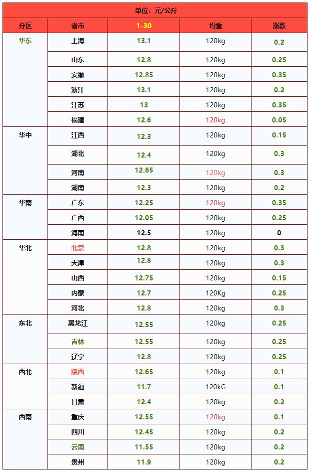 | 华中 | 河南省 | 12.84 | 12.97 | -1.00% | 元/KG |