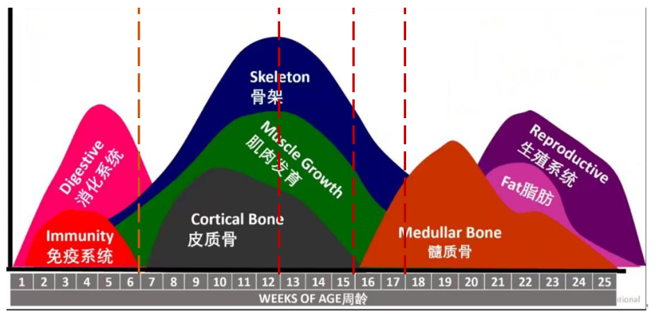 需按生长阶段动态调整营养配方:4-12周龄重点保证氨基酸均衡,促进肌肉与骨骼发育;13-18周龄适当降低能量供给,采用“限饲不限位”模式,避免腹腔脂肪过度堆积。