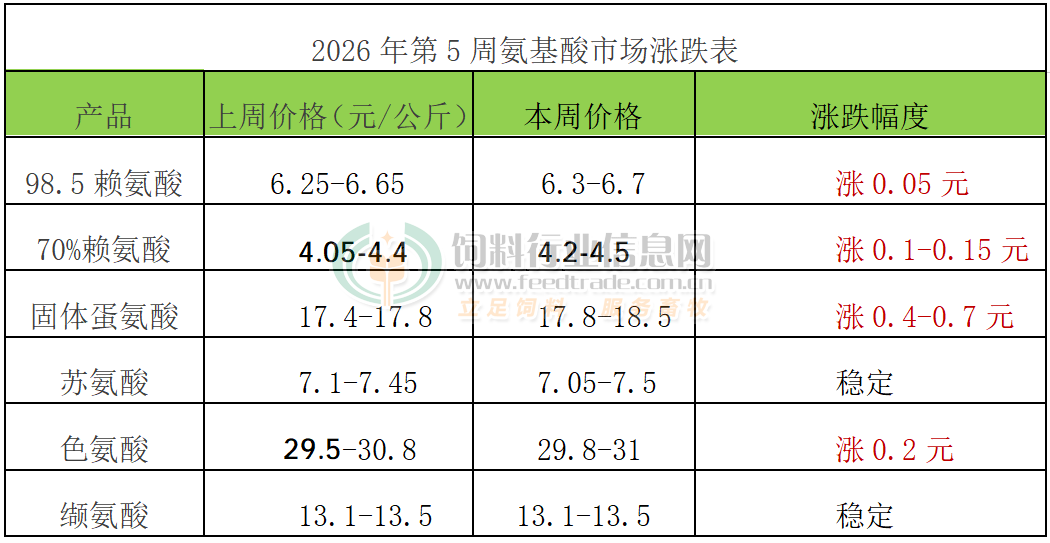 赖氨酸市场中,98%赖氨酸参考报价区间6.3-6.7元/公斤,70%赖氨酸参考报价区间4.2-4.5元/公斤。2025年12月,我国赖氨酸与赖氨酸盐及酯的出口量为9.8万吨,同比增0.4%,环比增8.4%。万里润达氨基酸生产线计划近日阶段性升级检修。出口量回升,且原料玉米价格有所上涨,厂家挺价意愿依存,本周星湖伊品98.5%赖氨酸上调150元/吨,70%赖氨酸上调200元/吨,赖氨酸市场成交上涨,稳中偏强运行。