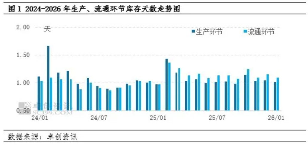 截至1月29日,全国主产区生产、流通环节库存天数呈先降后增趋势,月度库存天数环比降低,生产、流通环节库存天数分别为1.01天、1.09天,环比上月库存天数减少2.88%、5.22%,其中生产、流通环节库存天数最低水平为15日前后,分别为0.97天、1.05天,最高为月初1.04天、1.13天。