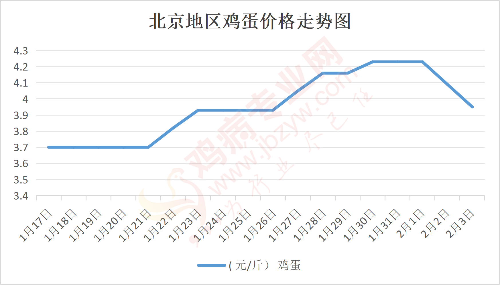 鸡病专业网消息:2月3日,北京大洋路鸡蛋主流批发价格174-175元/44斤,落,到货4台车,成交灵活,走货偏慢;回龙观鸡蛋174元/44斤,落;顺义石门鸡蛋174元/44斤,落。