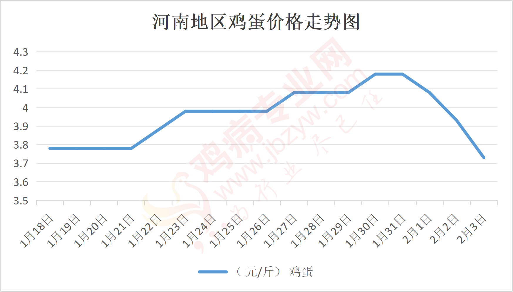 鸡病专业网消息:2月3日,河南郑州鸡蛋3.75元/斤,落;新密鸡蛋3.75元/斤,落;荥阳鸡蛋3.75元/斤,落;中牟鸡蛋3.75元/斤,落;周口鸡蛋3.7-3.75元/斤,落;商丘鸡蛋110元/30斤,落;鹤壁鸡蛋3.75元/斤,落;汝州鸡蛋3.75元/斤,落;开封鸡蛋110元/30斤,落;漯河鸡蛋3.65-3.75元/斤,落;漯河临颍鸡蛋3.65-3.75元/斤,落;许昌鸡蛋3.7-3.75元/斤,落;南阳鸡蛋3.75元/斤,落;南阳邓州鸡蛋3.75元/斤,落;新乡鸡蛋3.75元/斤,落;安阳鸡蛋3.75元/斤,落;新郑鸡蛋3.75元/斤,落;登封鸡蛋3.75元/斤,落;平顶山鸡蛋3.75元/斤,落;驻马店鸡蛋3.75元/斤,落;三门峡鸡蛋3.75元/斤,落;焦作鸡蛋3.75元/斤,落;信阳鸡蛋3.75元/斤,落;濮阳鸡蛋3.75元/斤,落。